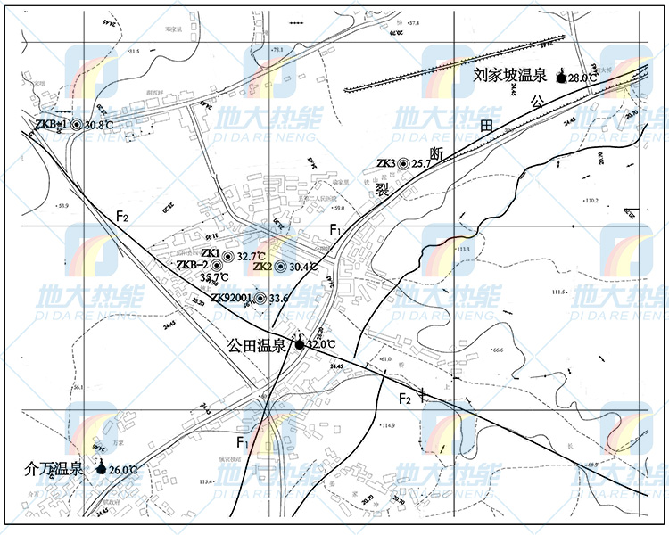 根據(jù)抽水試驗實測涌水量、水溫結(jié)合鉆孔與區(qū)內(nèi)斷裂構(gòu)造的相對位置分析,靠近F2則相對富水,水溫亦升高;且隨著含水層(公田斷裂破碎帶)埋深的增大,揭露的地下水溫也增高;地下水溫度與含水層埋深有關(guān),也和地下水賦水空間與深部熱源溝通程度有關(guān)。