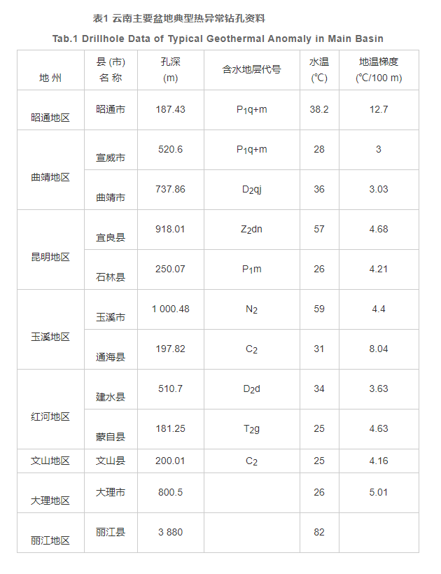 云南中低溫水熱活動(dòng)區(qū), 主要分布在滇東斷陷盆地中, 水溫相對較低, 但流量大, 共有地?zé)?/a>泉260余處, 地?zé)?/a>鉆孔100多個(gè), 熱泉天然熱流量7.8×104卡/秒, 泉流量4.9米3/秒。以往的勘探成果顯示, 昆明、玉溪、曲靖、昭通、紅河、文山地區(qū)的很多盆地中, 都存在有儲(chǔ)量較大的地?zé)崽?/a> (表1) 。